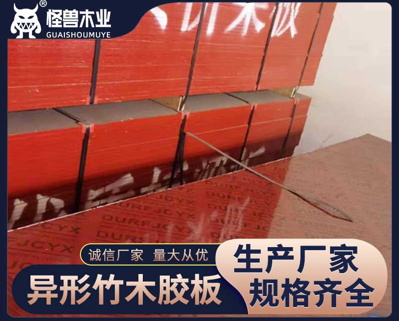 異形竹木膠板:竹膠板用竹子做的多層膠合板,木膠板就是木材及木鋸末做的膠合板。竹膠板比木膠合板耐用,周轉次數(shù)較多,剛度好,價格較高。但是木膠板在梁底等部位使用效果要好于竹膠板。