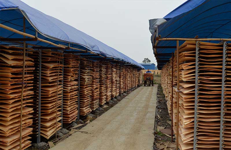 說到旋切廠,不得不提到的是怪獸木業(yè)曬板場(chǎng)。300畝的曬板場(chǎng)滿滿的都是芯板,怪獸木業(yè)的曬板場(chǎng)不僅曬旋切廠刨出來的板材,更多的是各個(gè)供應(yīng)商提供的濕板材。每天的板材曬干收,收完再曬,重復(fù)使用無間斷。工人們每天早晚都要巡場(chǎng),巡場(chǎng)不只為了檢查板是否曬干,更重要的是在巡查中一遍遍地挑出那些不合格的二級(jí)、三級(jí)板,保證怪獸木業(yè)模板原料的高純正性。